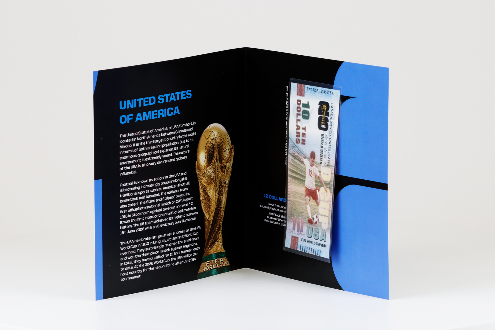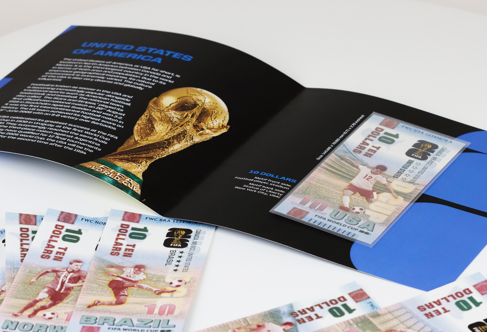 For each note, we have produced an individual folding card with interesting information about the respective country and the national team. Furthermore, the folding cards feature FIFA World Cup 2026™ license details and a security hologram with a QR code. Using the QR code, the product can be authenticated.