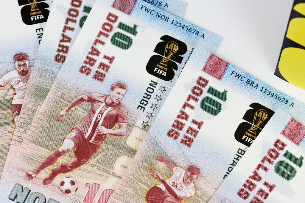 Each collectible item is dedicated to one of the 48 countries participating in the World Cup. The front sides depict football players and stadiums, while the back sides show important buildings from the various countries. The notes are provided with state-of-the-art security features such as UV ink and a hologram.